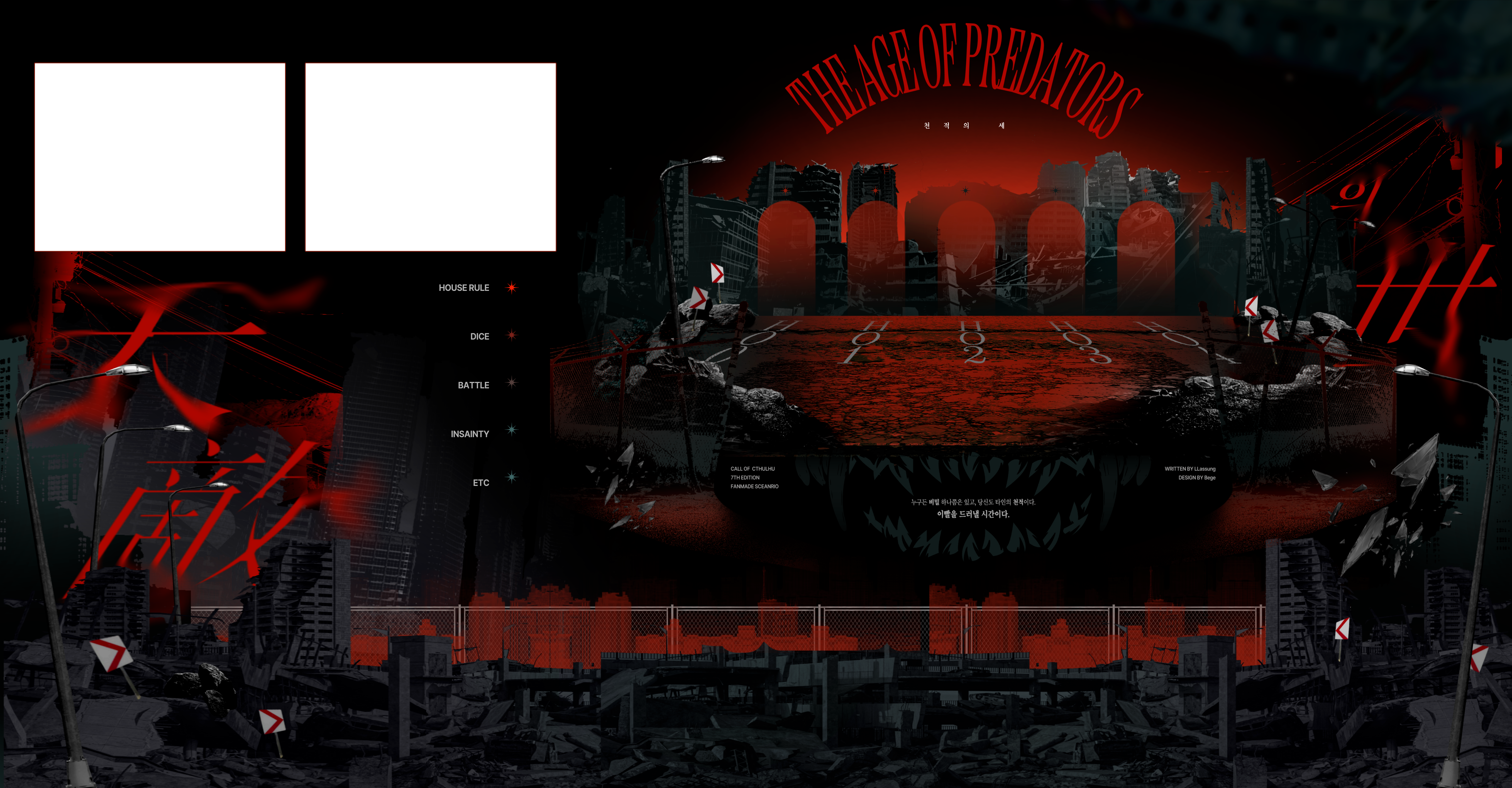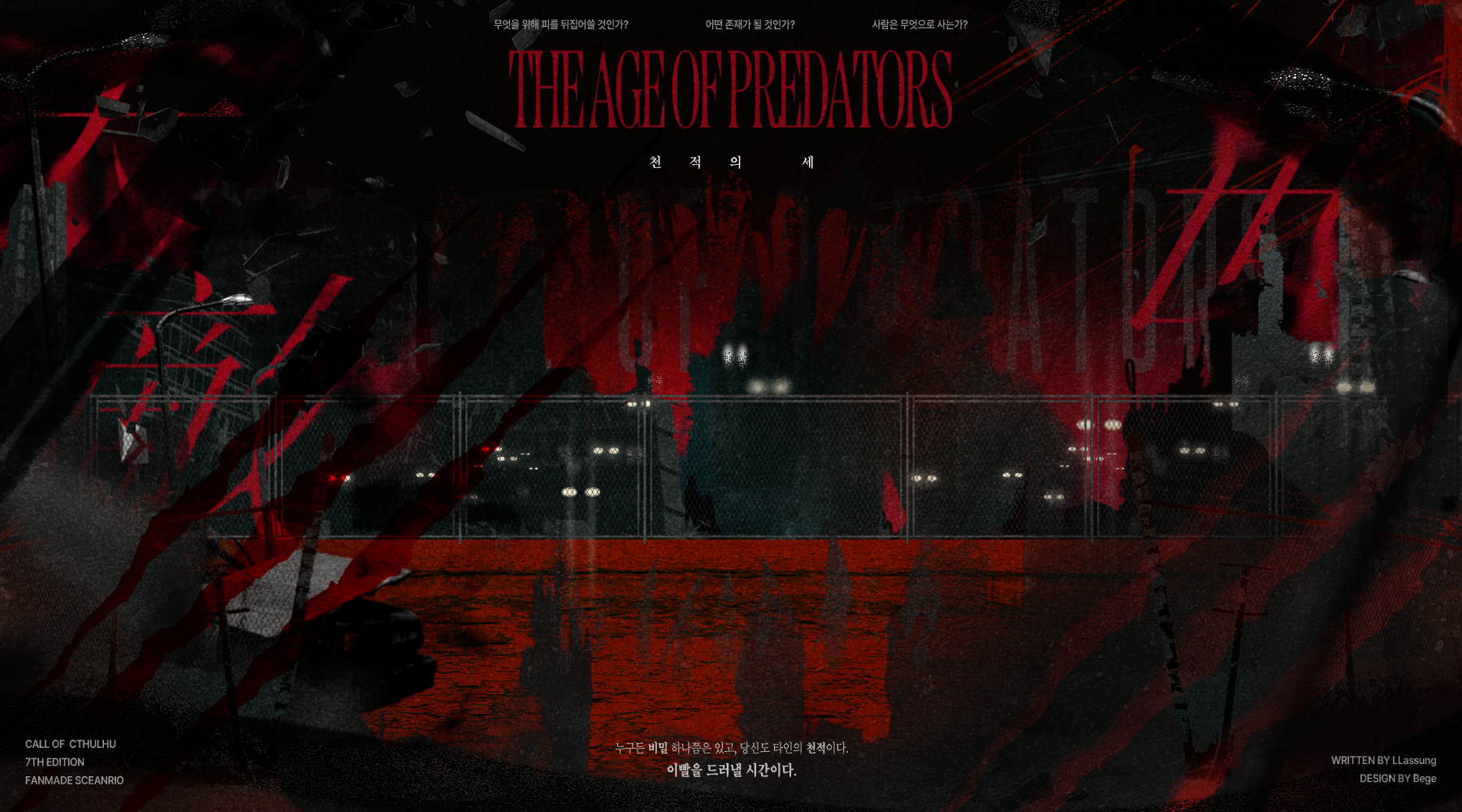 CoC 7판 시나리오 《천적의 세》를 배포합니다. 누구든 비밀 하나쯤은 있고, 당신도 타인의 천적이다. 이빨을 드러내야만 하는 때가 온다. 좀비 아포칼립스 | 기존 캐릭터 • 페어로 플레이 가능